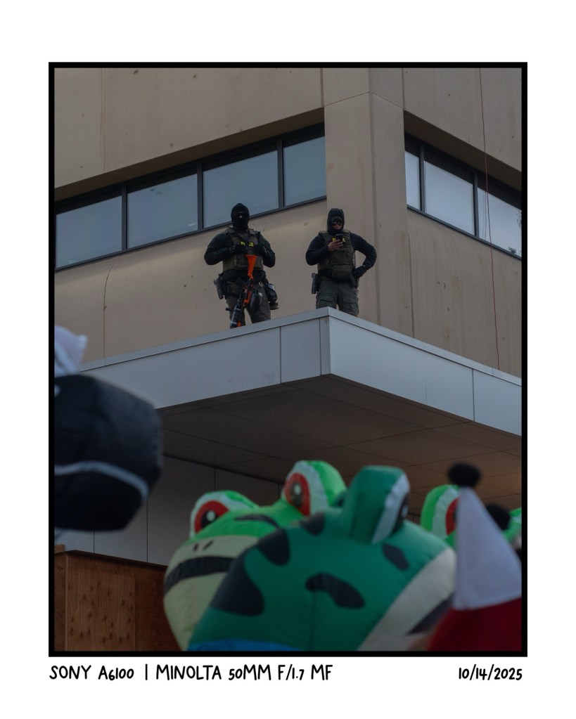 Last photo from the ICE facility but also I think the one that highlights the reality of the protests outside the ICE facility and where the violence comes from. Have one ICE agent standing up there with a pepper ball gun as a show of force while the other agent is on their phone. Below the menacing frog protestors (and other terrifying inflatable people) loudly express their disgust with ICE/DHS and their practices.