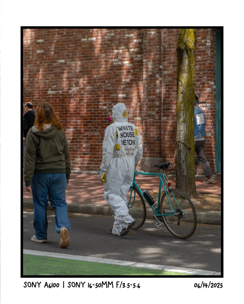 First time taking my Sony camera and bike (Primos Dame) to Portland together! This photo was captured during the No Kings Protest a couple blocks from the waterfront. Outfit speaks for itself but combined with the bike gives off a quintessential Portland vibe.